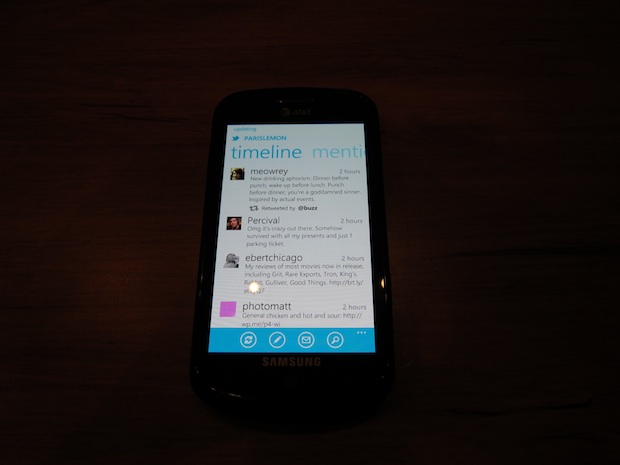 The Windows Phone I’ve been using is the Samsung Focus. It has a 1Ghz processor, a 4-inch Super AMOLED display, a 5 megapixel camera, and 8 gigabytes of internal storage (which can be beefed up via the microSD slot). The device runs on AT&T’s network — which, as we’re all probably well aware by now, is pretty awful in the Bay Area.