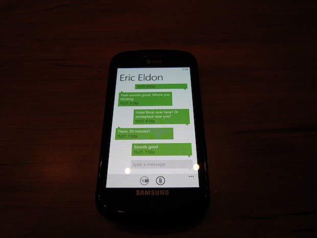 Call quality when AT&T is playing nice (meaning, it’s not raining, I’m not in SoMa, etc…) seems quite good. I love text messaging on the device because I prefer the Metro style Windows Phone uses versus the cutesy bubble style iOS uses.