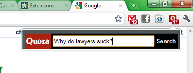 Addicted to Quora? Wish there were a way to search the Q&A site directly from your browser as well as receive notifications about your notifications while surfing the web? Well, this awesome Google Chrome extension created by Andrew Brown is just what your browser ordered.