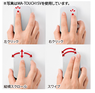 From a design perspective, the MA-Touch1 is completely flat on top – unlike the Magic Mouse, which has a curvy top shell. Users will be able to do four-direction scrolling, two-finger swipes, and right/left clicks (see below). Two AAA batteries will let you use the mouse for about 200 hours.