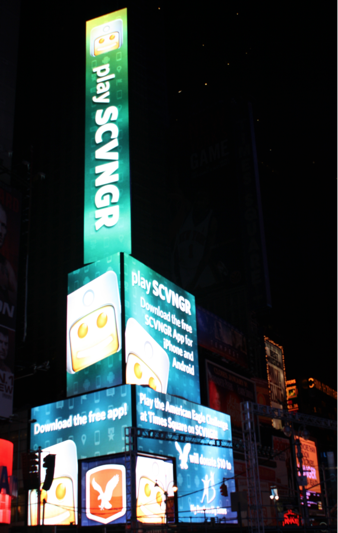 In a few nights, an estimated 1 million people are going to pack into New York’s Times Square for New Year’s Eve (brrr). And amidst all of the confetti, snow, and alcohol, they’re going to see a whole lot of ads, which is what Times Square does best. One of them represents a win for location-based mobile game SCVNGR: the service will be prominently featured on American Eagle’s Times Square billboard starting today and running through the new year.