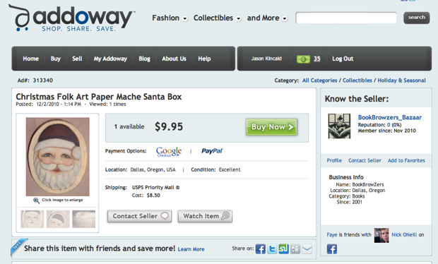 This is a very difficult market to crack into, especially given how much traction Addoway will need for its social connections to become useful, and Nijm knows it. Still, he says that this is the only service that uses Facebook Connect to help buyers pick out reputable sellers (as opposed to using it for product recommendations, the way Amazon does), and he says that Addoway has seen significant growth over the last several months, going from 60,000 uniques a couple of months ago to 90,000 today.