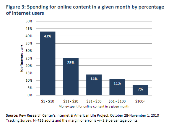 The Pew Internet organization put out results of a survey on how many people pay for digital content online. The study found that 65 percent of people online have paid to download some form of digital content or for a subscription to a digital media service. The survey excluded physical goods bought online and was focussed only on digital content such as music, software, news, and other online or electronic publications.