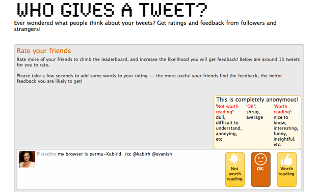 Because everything eventually becomes an academic field (I’m still waiting for “Internet” to become a major), researchers from MIT, University of Southampton and Georgia Institute of Technology have teamed up to build Who Gives A Tweet, a Twitter app that allows users to anonymously rate their friends’ and strangers’ tweets in order gain more insight into status update perception. Kind of like Hot Or Not, but for tweets.