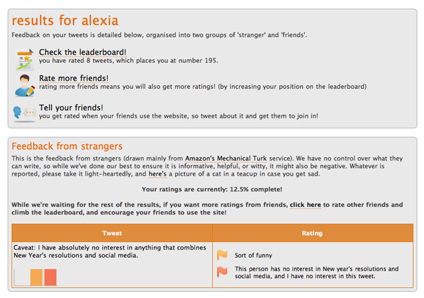 Aside from serving up feedback from your friends, the app also gives you tweet feedback from strangers via Amazon’s Mechanical Turk. Thus far I have been rated by two people on my “Caveat: I have absolutely no interest in anything that combines New Year’s resolutions and social media” tweet from yesterday. While one person found it “Sort of funny” another said “This person has no interest in New year’s resolutions and social media, and I have no interest in this tweet.” Ouch.