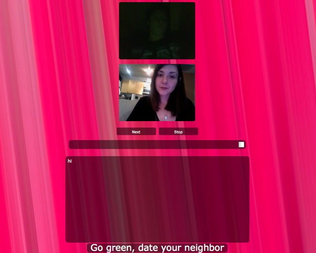 After following a cryptic tweet from the @Chatroulette Twitter account (“chatroulette is back ! a new face chatroulette.com”) down a rabbit hole, I discovered that you can now change your background on Chatroulette while you chat. In my brief foray, I’ve seen everything from Greek mythology-theme to rainbow hyper-color to sunburst to paisley to the hot pink we’ve got going on above.