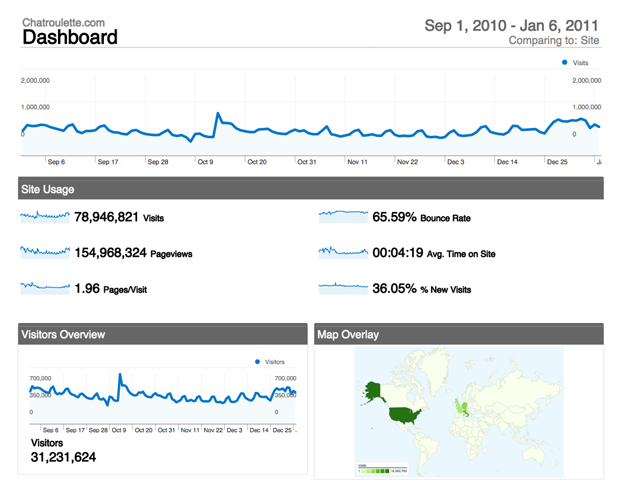 Update: It gets curiouser and curiouser. Ternovskiy just emailed to inform me that @Chatroulette is not an official Twitter account, and despite what Google trends is showing, site traffic has been up since October. The Skinsroulette feature, which the company did not intend to announce, was put into effect a couple days ago. Here’s what his own internal Google Analytics dashboard shows, below.