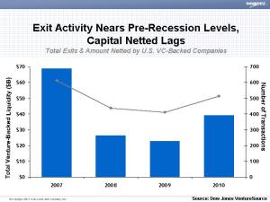 But at least on a year-over-year basis the exits are getting a lot bigger. In 2010 companies returned 72% more money than the companies that exited in 2009, although at just south of $40 billion it’s about 40% less than the $69.1 billion returned to investors in 2007.