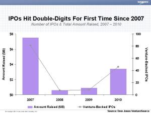 Overall in 2010, the number of exits increased 25% from 2009, but considering the economic state the world was in two years ago, that’s not saying a lot. In all 514 companies went public or got acquired in 2010, netting some $39.3 billion in capital. Those totals still fell short of the 613 companies that exited 2007– the last decent year on record.