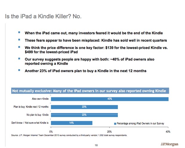 The Kindle is a very different device. In fact, in a recent survey of about 1,000 consumers by JP Morgan’s Internet team, 40 percent of iPad owners also own a Kindle. That sounds a little high to me, although it does describe everyone I know who owns an iPad. According to the same survey, another 23 percent of iPad owners plan on buying a Kindle in the next 12 months.