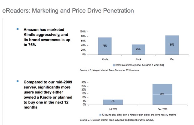 Amazon’s aggressive Kindle advertising is also paying off. The Kindle has 76 percent brand awareness, which is almost up there with the iPad’s 84 percent. And that is much better than its direct ebook competitor, the Nook, which has 45 percent. And 28 percent of respondents say they either own or plan to buy a Kindle in the next 12 months, compared to 7 percent in July, 2009.