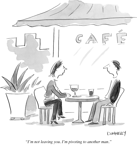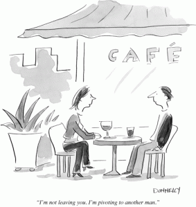 Maybe you all saw this, but I’m catching up from vacation. It seems even the venerable, old-school New Yorker is mocking the over-use of the word “pivot.” And they are doing it in old-school cartoon form, no less. (As pointed out by Eric Ries here.) If you can’t read it below the caption says, “I’m not leaving you. I’m pivoting to another man.” Brilliant.