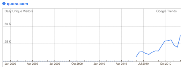 If you’re on Quora and have signed up for email alerts, you probably noticed a massive influx of “follow” emails over the past two weeks, including some unlikely ones from top brands. This userbase expanision is hard to ignore, culminating in Quora surpassing 25K daily unique visitors during the last week of December, according to Google Trends.