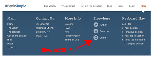 While co-founders Adam D’Angelo and Charlie Cheever are famously quiet about Quora’s user and traffic numbers, entrepreneur Semil Shah has discovered something even more indicative of the site’s entrance into A-List status — A Quora button right along side that off Facebook and Twitter on startup BankSimple‘s website. A sign of an impending Twitter moment?