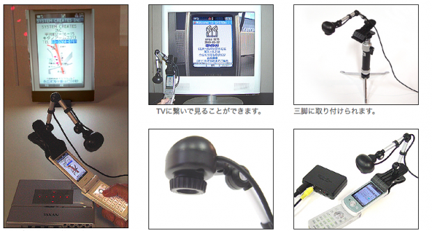 Have you ever needed to project the display of a cell phone or portable gadget on a TV or big screen? If yes, you know that this is often a pain (for example, during a presentation) – but Sanyo’s Sha-Miel [JP] might do the trick for you. It’s essentially a flexible magnifying camera for displays of mobile devices.