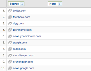As you can see, like the WordPress.com data, Twitter is number one, but the rest are switched around. Facebook pushed Digg to number three. And Hacker News (news.ycombinator.com) swapped with Techmeme. Google Reader, meanwhile, is nowhere to be found in the Google Analytics data. Actually, it is — it’s a subset of the google.com traffic (which doesn’t include search traffic, which is far above any of these referrer sites).