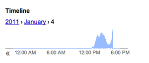 Update #2: Twitter’s response at 9:14 PST, “We don’t have this info easily accessible.” I don’t blame them. In the meantime, here’s the Google Trends graph of the frequency in realtime updates including the hashtag.