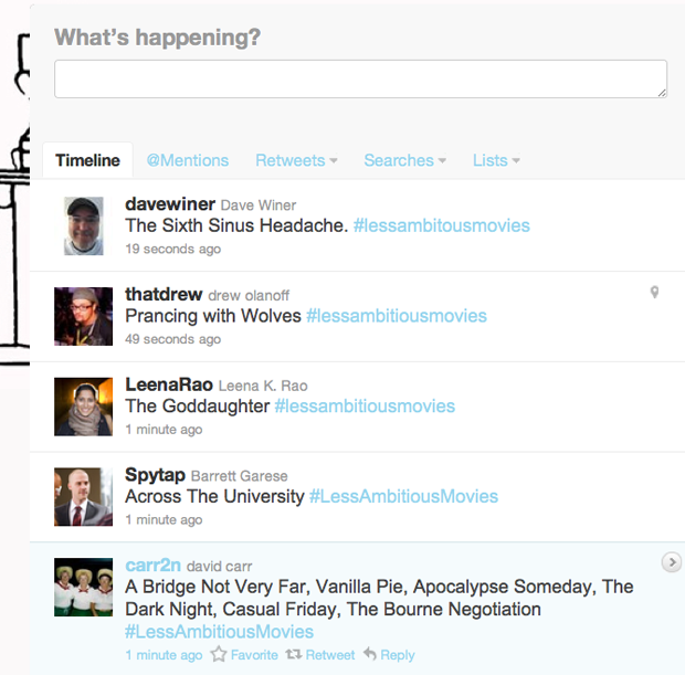 Hey you know what’s happening right now? #LessAmbitiousMovies, the craziest Twitter hashtag meme I’ve ever seen, pacing at around 200 tweets per minute. The basic premise is to tweet out the titles of popular films but watered down and less ambitious, get it?