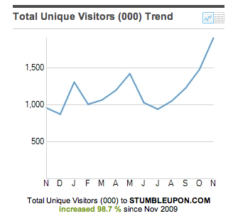 I spoke with Camp earlier today about what exactly this recent news means for the company and why StumbleUpon seems to be killing it since August, clocking in about 1.9 million unique visitors in November according to Comscore. The site has served up over 700 million “Stumbles” (referral pageviews to other websites) in December 2010 compared to 400 million Stumbles in December of 2009, according to internal analytics.
