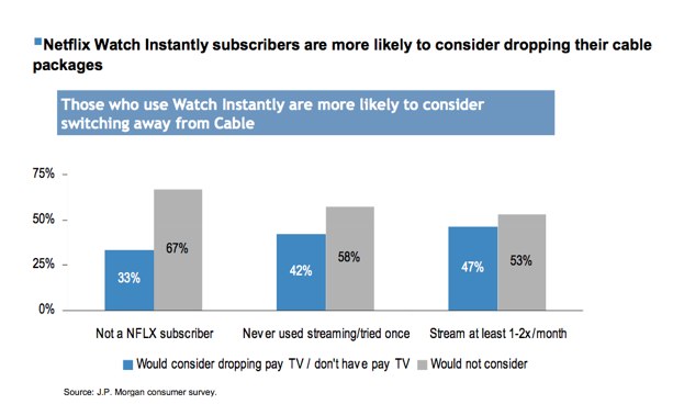 In a presentation put together by J.P. Morgan’s Internet analyst Imran Khan (which also goes into ecommerce and ebook trends) is the slide above, which shows the results of a consumer survey titled “Netflix Watch Instantly subscribers are more likely to consider dropping their cabe packages.” Of those surveyed who stream one to two movies and TV shows a month from Netflix, 47 percent would “consider dropping pay TV,” compared to only 33 percent of non-Netflix subscribers. By the way, the fact that a third of people who don’t even have access to Netflix streaming are ready to ditch cable should worry the industry even more. But once they get into the habit of streaming video from the Internet, the number of potential cord cutters goes up by 14 percentage points.