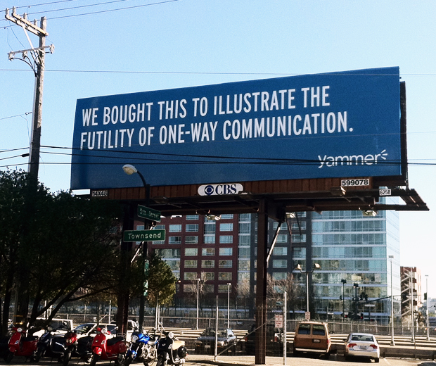 Yeah, our officemate Yammer has decided to wedge a billboard-sized nail in the coffin of old media (i.e. “one-way communication”) which conspicuously includes print magazines, newspapers and eh hem, billboards. Says Yammer marketing designer Aria Shen, “Simply put, we wanted to make a statement about the new paradigm of how people and organizations communicate, and figured what better way to do that than to use the oldest mode of paid media.”