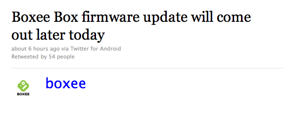 A cryptic Tweet from Boxee points to a new firmware version rolling out in the next few hours, one that probably promises Vudu and Hulu content on what Matt calls “his favorite box.”