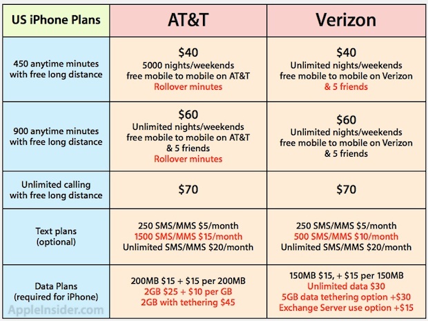 AppleInsider has a nice breakdown of what this actually means. While the core talk-time and text plans are largely the same on the two networks (though AT&T has rollover minutes), AT&T no longer offers unlimited data plans. Instead their highest data plan is 2 gigabytes for $25 a month. After those 2 gigs, each additional gig is $10. Verizon, meanwhile, if the plans do stay the same, will offer unlimited data for a flat $30 fee.