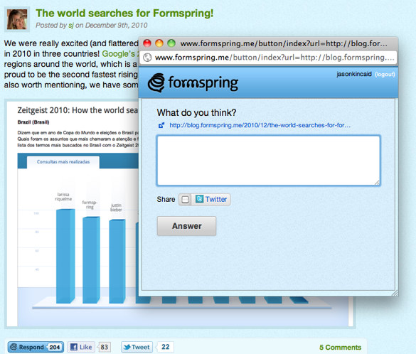 The feature lets publishers integrate some Q&A functionality into their own sites. Hit one of these ‘Respond’ buttons, which generally appear next to Twitter and Facebook ‘Like’ widgets on publisher sites, and a window will pop up prompting you to answer a question related to the article (the question could be vague like “What do you think”, or it can be more specific). Once the user submits the form, their answer appears on their Formspring profile along with a link to the publisher site. This doesn’t seem to have the same viral potential as, say, a tweet, though you can tweet out your response automatically.