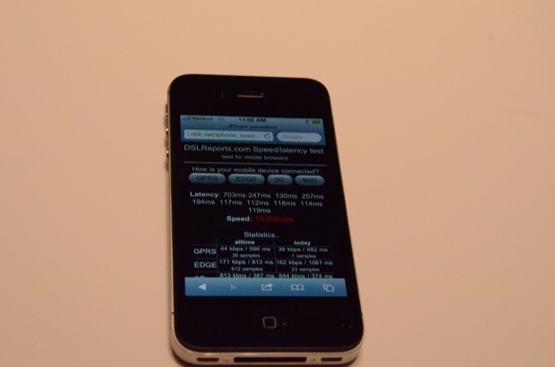 So I hit 1536 kbps in this room. Your results may vary. AT&T hit 107 kbps on the first try. Granted, this cell is probably iPhone saturated right now, but that’s a pretty nasty difference. A second try got 64kbps.