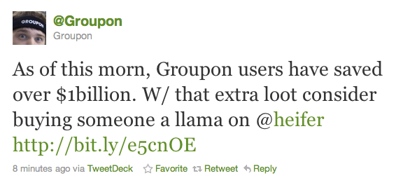 Groupon’s daily deals often come with steep discounts of 50% or more — Groupon is presumably totaling all of these discounts to reach its $1 billion stat. Of course, the site isn’t exactly saving you money, because its hot deals often lead people to purchase things they wouldn’t buy otherwise (I’m still trying to figure out what I’m going to do with my $50 voucher for art supplies).