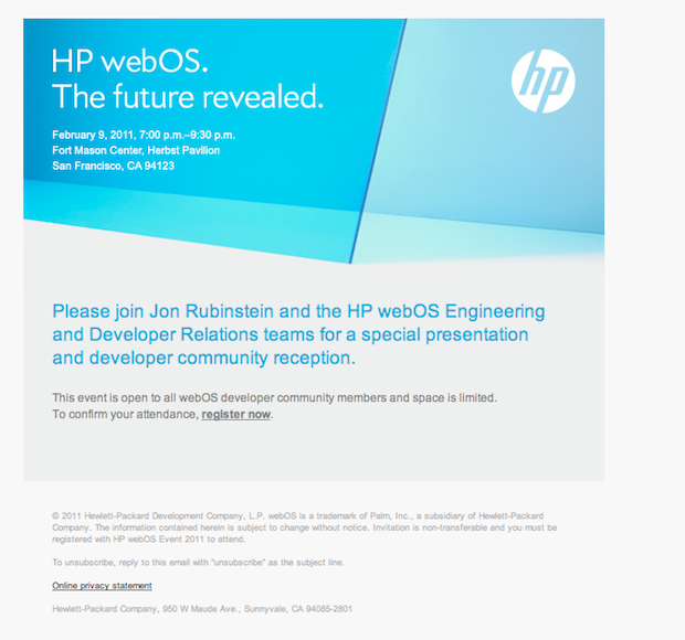 So what’s this all about? The next line is key: “Please join Jon Rubinstein and the HP webOS Engineering and Developer Relations teams for a special presentation and developer community reception.” In other words, it’s a developer event being held the night after they reveal what they’re doing to reveal at their press event. Makes sense. It looks like HP wants to get to work ASAP.