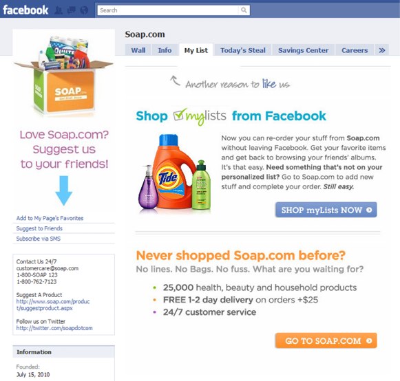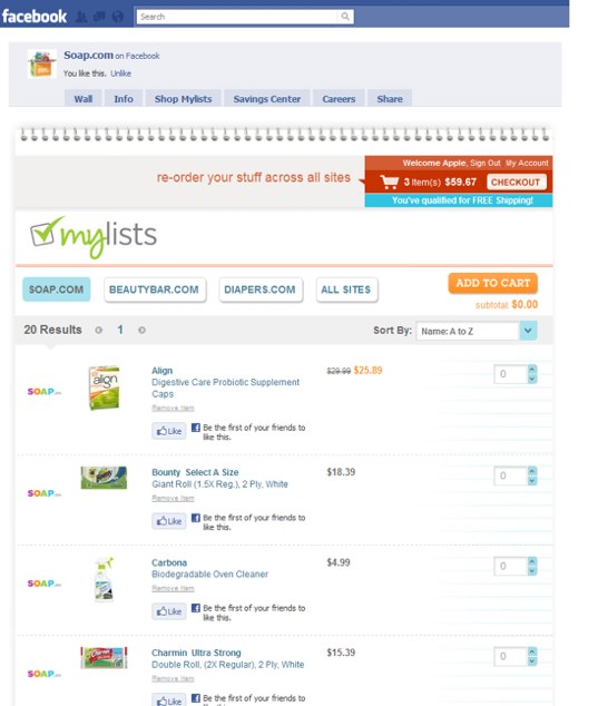 On the Facebook pages for Quidsi-owner properties Soap.com, BeautyBar.com and Diapers.com, existing users of the shopping sites will be able to shop for products directly from the social network under a tab called “Shop My List.” Members will be able to access their Diapers.com and Soap.com shopping lists by logging in with their Quidsi credentials and then complete a purchase of all or some of these products without ever leaving Facebook. And customers can shop on all three sites via one tab (so users can order Soap items while on the Diapers page) and like individual products.