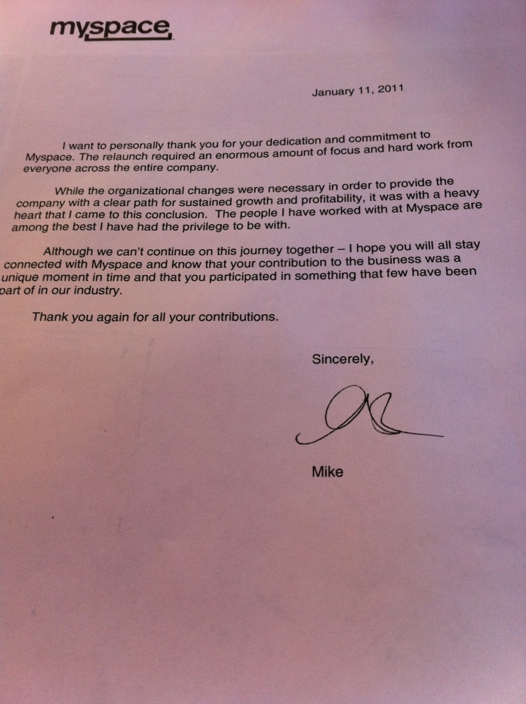 I won’t repeat the character assassinations here, but the former MySpacer did include something else I will share: The kiss-off letter from CEO Mike Jones. “He didn’t even take the time to personally sign the letters. It’s just a xerox copy,” laments the former employee. You can read the termination letter below. It is pretty standard, thanking those being laid off for their “dedication and commitment to MySpace” especially through its recent relaunch.