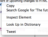 For example, if you’re browsing the web in Safari or Chrome, highlight a word or passage and right-click. At the bottom of the drop-down, you’ll see the “Tweet” command. Hitting it will populate a tweet for you with the highlighted section. And it works in TextEdit, iChat, Calendar, Mail, etc. If you read it, you can tweet it.