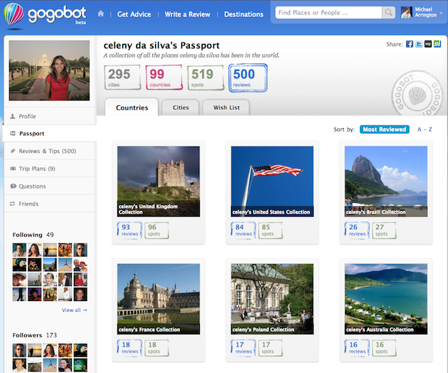 Here’s the Passport for Celeny Da Silva, a very active Gogobot user. She’s written 500 detailed reviews in 295 cities and 99 countries – clearly she likes to travel.