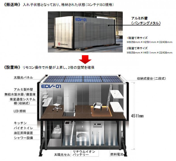 Daiwa says that it just needs the push of a button to set up the house. According to the company, the EDV-01 is in standby mode after 4 minutes. Each unit is sized at 6058mm×H2591mm×D2438mm and weighs 10 tons.