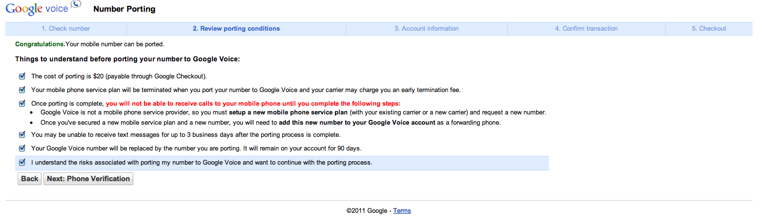 The feature was first noticed by Engadget, and I’m seeing it in my Google Voice account as well. The process appears to be fairly straightforward (and yet terrifying at the same time): tell Google your existing cell phone number, agree to some strongly worded warnings, pay $20, and you should be in business.