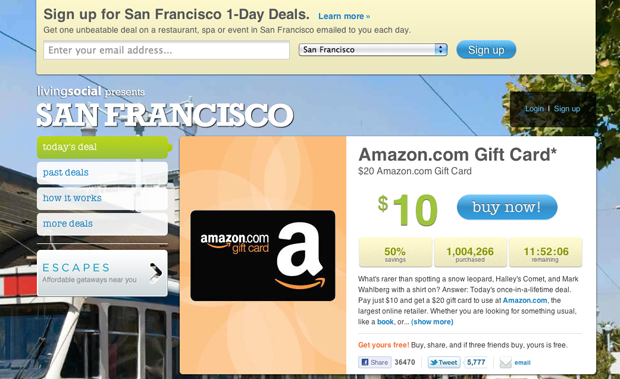 LivingSocial has been offering $10 off any $20 Amazon purchase since 5 am this morning and it’s been a boon huge for the daily deals company, which Amazon has astutely invested $175 million in. Now the extremely popular deal has just crossed over the one million mark, with 12 hours to go. LivingSocial tells us that there are currently 99.4K vouchers being sold each hour, 2k vouchers being sold each minute and 85 vouchers being sold each second.