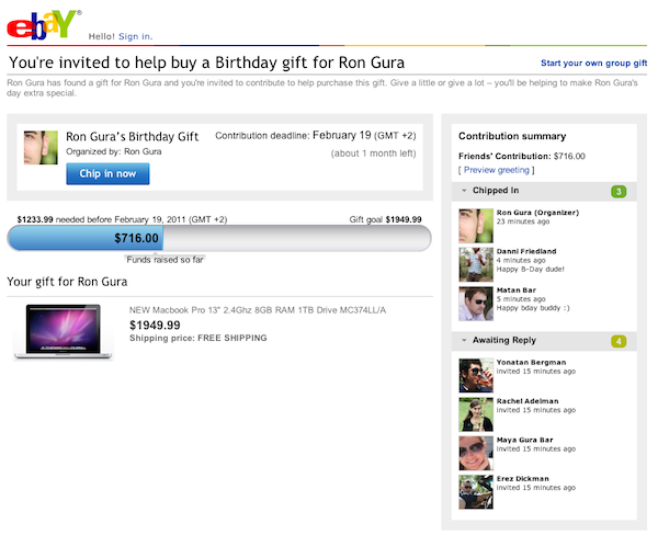 The eBay deal is a tier-1 endorsement for social commerce by an ecommerce giant. But also, it’s a major vote of confidence in The Gifts Project’s ability to support major online retailers as a technology provider, because surprisingly, eBay Group Gifts was hosted on by The Gift Project, rather than on eBay’s infrastructure.