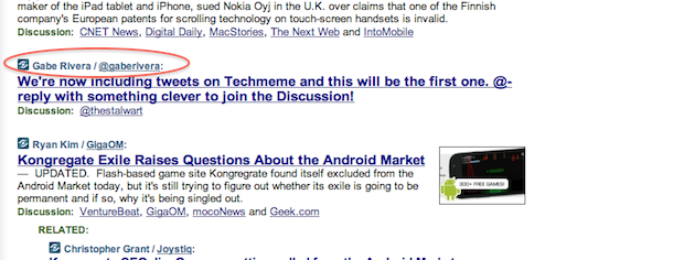 Tweets will also be able to hit Techmeme in the discussion section (the smaller area of links below the main headlines). Here, Rivera expects more commentary about news items to appear. So if Robert Scoble has something interesting to say about a new Microsoft announcement, it could land here, for example.