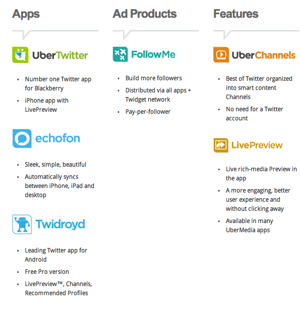 UberMedia is the leading independent developer of applications and web-based services that make it easier for users to find, follow and communicate with others on Twitter and other social media platforms. The company is focused on driving innovation in user experiences across a range of online and mobile platforms. UberMedia also provides advertisers and brands with new ways to engage and communicate with consumers via Twitter through its family of apps.