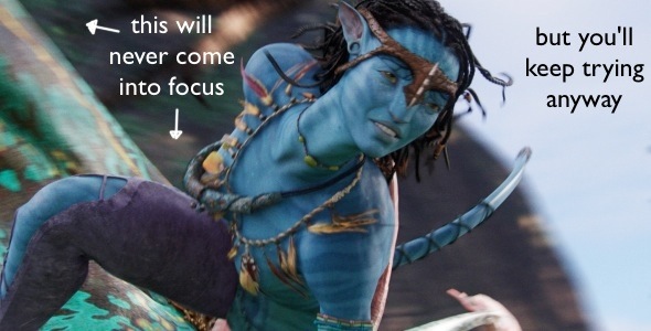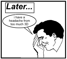 His main problem is the convergence/focus issue. I discussed it in depth here, along with most of the other problems faced by 3D, but the gist is this: our vision has been trained to both converge our eyes and focus them at the same point, and 3D breaks that rule. Your eyes must always have the screen in focus, but they move around and converge on different points, sometimes close to you (when something comes “out” of the screen) and sometimes far away, “behind” the screen. As I noted before, this causes fatigue in your eye muscles, and can cause disorientation and headaches.