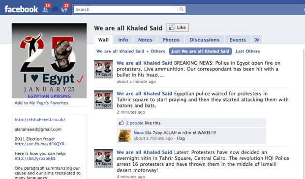 Facebook is also being used to organize the demonstrations, with groups also popping up around the world to document the uprising and lend its support. For instance, one Facebook Group called We Are All Khaled Said, features up-to-the-minute updates on the protests and photos from the scene. Khaled Said was “a young man brutally tortured and killed by police in Alexandria,” explains Blake Hounshell on the Foreign Policy blog, and his death has become a rallying point for the demonstrations which fall on “Police Day,” a national holiday in Egypt.