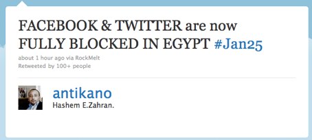 Similar to the protests in Tunisia, the Egyptian demonstrations were partly organized on Facebook and Twitter. And yesterday, Twitter was blocked in Egypt.