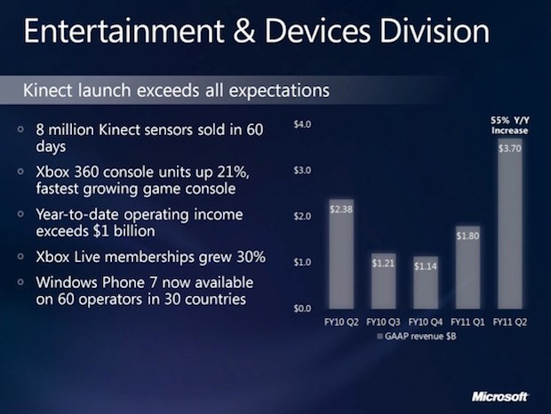 Microsoft earnings just got released 10 minutes before market close, and aside from growing revenues 5% in the 2nd quarter to $19.95 Billion, their slides reveal some interesting numbers on their entertainment and gaming unit, mainly that they sold 8 million Kinects in the two months since launch.