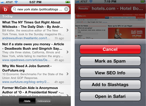 The app has a simple interface which allows you to view search results whether or not you are logged in with your Blekko account. With the exception of Facebook integration, the app pretty much provides the gamut of features found on Blekko itself, most notably the ability to search by /slashtag or curated topic. Results are sorted by most relevant and by date.