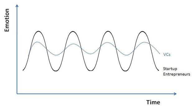 The reality is that the majority of successes & failures are created by and experienced by the entrepreneurs. The VC sense of accomplishment or failure is blunted by being slightly removed and by the portfolio effect. I think it looks something like the graph below.