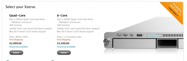The Apple Xserve is at the end of its life. Today’s the last day you can pick one up directly from Apple.com. Sorry, everyone. There’s cake in the break room and you’re going to have to look elsewhere for your Apple rackmounted solutions — or throw the $999 Mac mini Snow Leopard Server on table and hook up a couple of external hard drives.