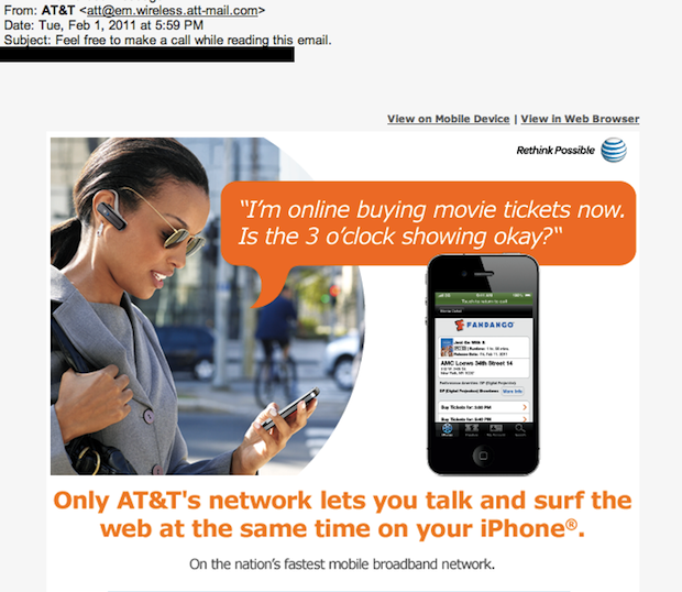 The body of the email has a woman using her phone with a Bluetooth headset. She’s clearly talking to someone while surfing the web at the same time as there’s a speech bubble saying “I’m online buying movie tickets now. Is the 3 o’clock showing okay?” Below that, there’s this statement: “Only AT&T’s network lets you talk and surf the web at the same time on your iPhone.”