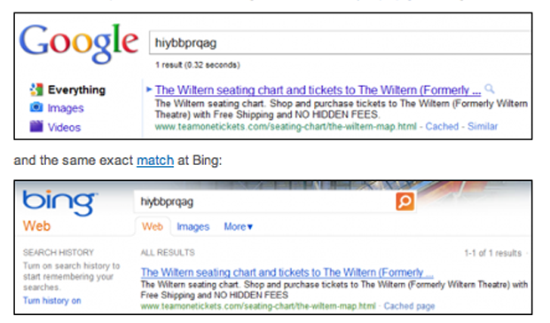 Cutts took issue with Microsoft’s statement that they did not copy Google’s results, “Microsoft said they don’t copy the results and we have screenshots that prove that happened.” It does seem from Danny Sullivan’s post that Bing is tailoring its results with Google data, as Google’s honey pot nonsense queries showed up on Bing weeks later. See below: